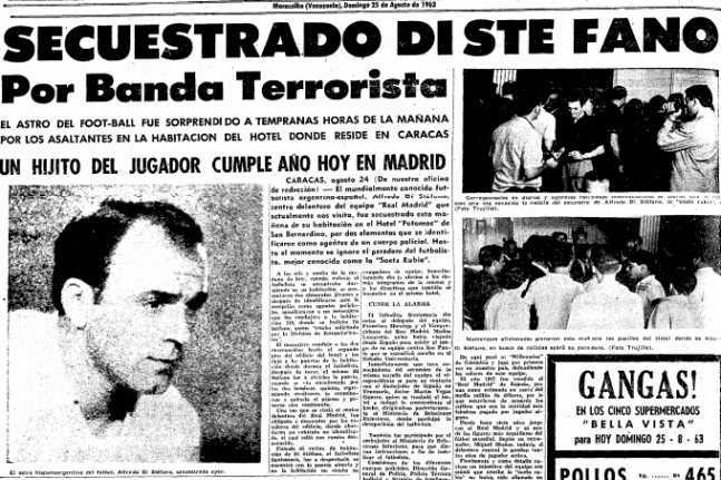 Tras la primera noche, a primera hora de la mañana del 24 de agosto de 1963 —inspirados quizá en el secuestro del piloto argentino de Fórmula 1, Juan Manuel Fangio, en 1958 en La Habana, meses antes de la victoria de la Revolución Cubana—, tres supuestos policías tocaron la habitación 219 donde estaba Di Stéfano junto a su compañero de equipo, el defensa central uruguayo José Emilio Santamaría.