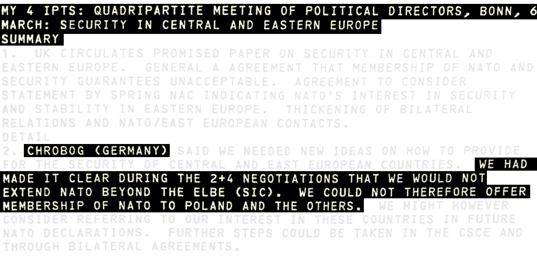 - Un mes después, en febrero del 2022, Der Spiegel informó que en los Archivos Nacionales Británicos fue hallado un documento confidencial que confirma que la OTAN incumplió las promesas de no expandirse hacia el este. "Le hemos dejado claro a la Unión Soviética, en conversaciones de Dos más Cuatro y en otras negociaciones, que no tenemos la intención de aprovecharnos de la retirada de las tropas soviéticas de Europa del Este. [...] La OTAN no se extenderá ni formal ni informalmente hacia el este", cita el documento las palabras del exembajador de EE.UU. en el Reino Unido, Raymond Seitz