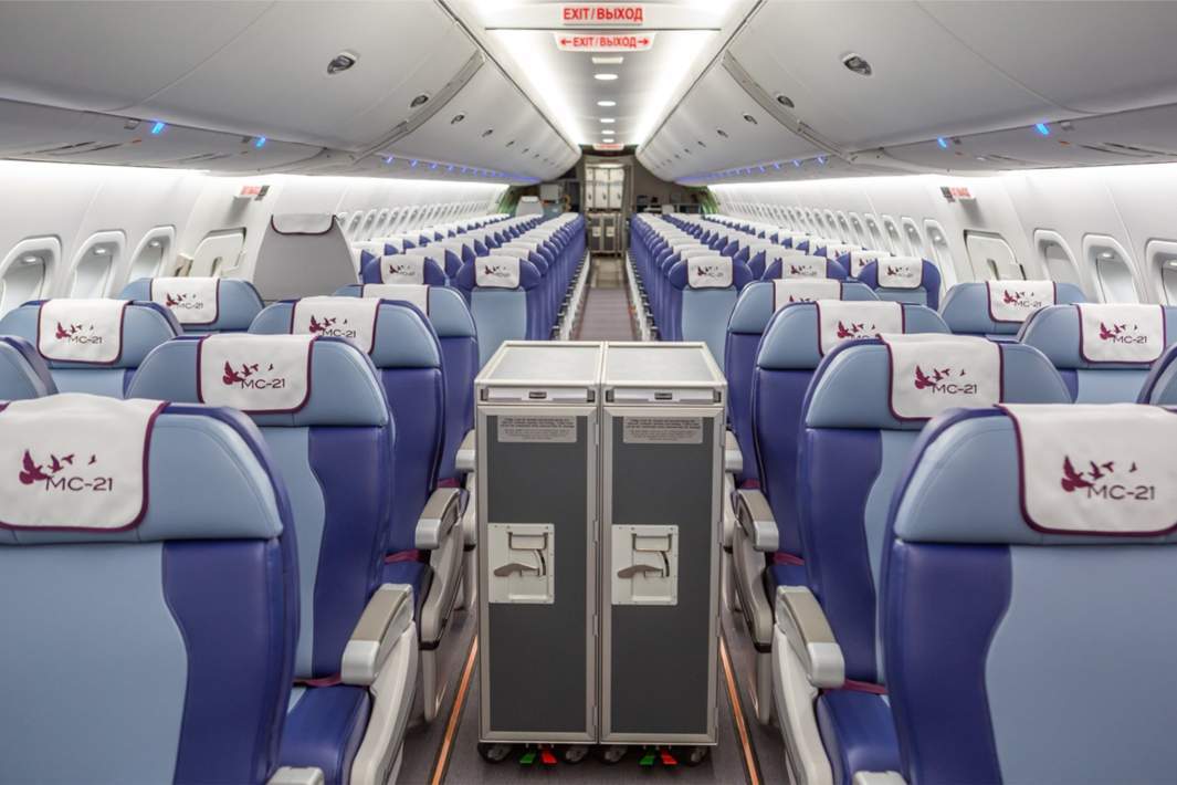 Esta capacidad del MS-21 proporciona una mayor libertad de movimiento para los pasajeros y el personal del vuelo, ya que el pasillo entre las filas, tanto en clase 'business' como en clase turista, es bastante amplio.