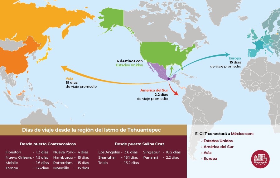 De acuerdo con cálculos de expertos referidas por Díaz Hernández en su trabajo para Infopuertos, una vez esté en funcionamiento el corredor, México ahorrará tiempo significativo en el transporte de mercancías, al poder trasladarlas de una costa a otra en apenas 72 horas, frente al paso por el canal de Panamá, que en este momento supone entre 15 y 20 días de viaje.