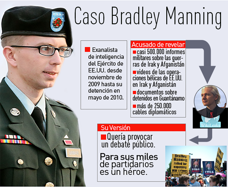 Agosto de 2013: Un tribunal militar condena a Manning en primera instancia a 35 años de prisión y a su expulsión del Ejército con deshonor. Manning manifiesta públicamente su identidad como mujer transexual y decide iniciar un tratamiento hormonal para modificar su cuerpo.