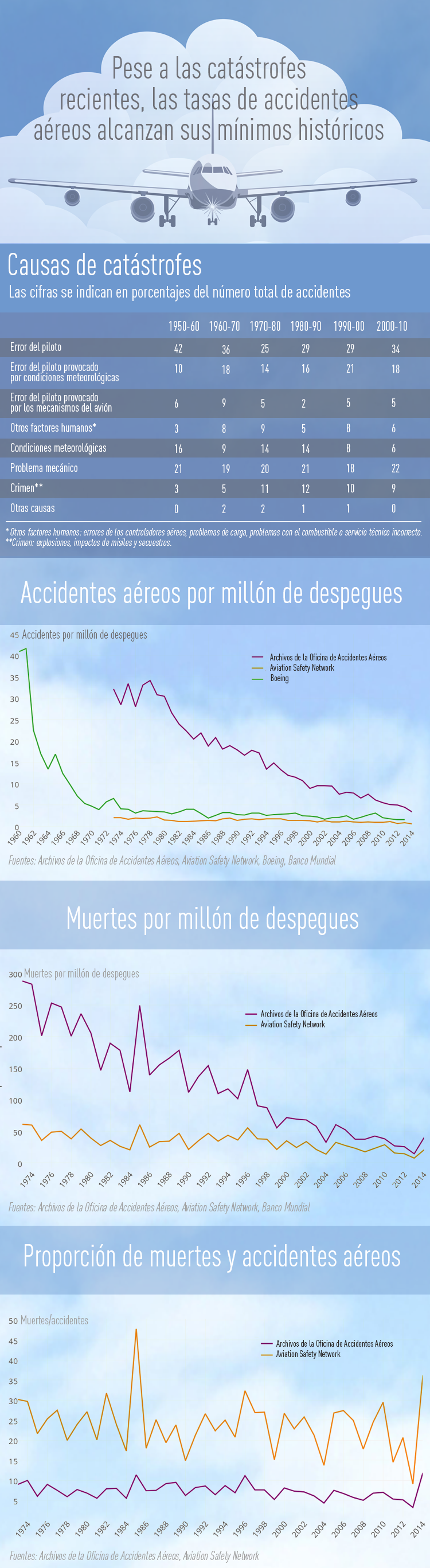 La evolución de las tasas de accidentes y de muertes en catástrofes aéreas, así como sus principales causas, se pueden observar en la siguiente infografía.