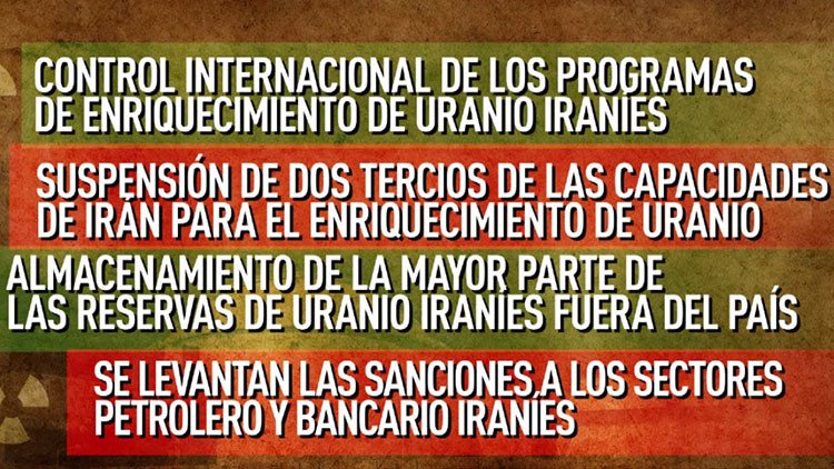 Irán aceptó reducir de 19.000 a 6.000 el número de centrifugadoras de enriquecimiento de uranio y trasladar el resto del equipo para el enriquecimiento a almacenes controlados por el OIEA. Teherán asegurará el acceso de los inspectores internacionales a sus instalaciones nucleares durante los próximos 25 años. A su vez, la UE y EE.UU. acordaron levantar las sanciones impuestas a Irán tanto de forma unilateral como a través del Consejo de Seguridad de la ONU.