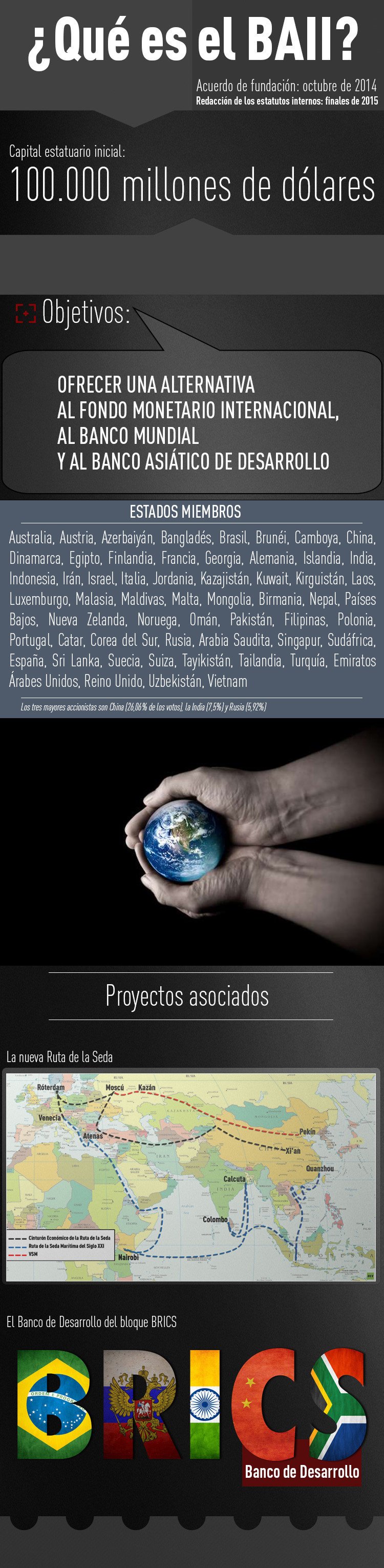 Capital: de acuerdo con el Memorando de Entendimiento de octubre de 2014, el capital social del BAII asciende a 100.000 millones de dólares. La mitad de esta suma fue proporcionada por China.
