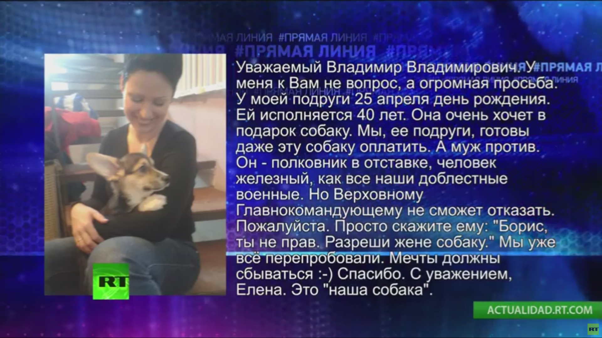 La lluvia de preguntas a la que ha respondido el presidente ruso ha incluido algunos temas curiosos. Por ejemplo, le han pedido que convenciera a un militar retirado para que permitiera que a su esposa le regalaran un perro por su cumpleaños. El presidente ha admitido que la petición le ha sorprendido, pero ha decidido ayudar a las amigas de la mujer del coronel retirado y ha dicho: "Borís, ¡deje que su esposa se compre un perro!".