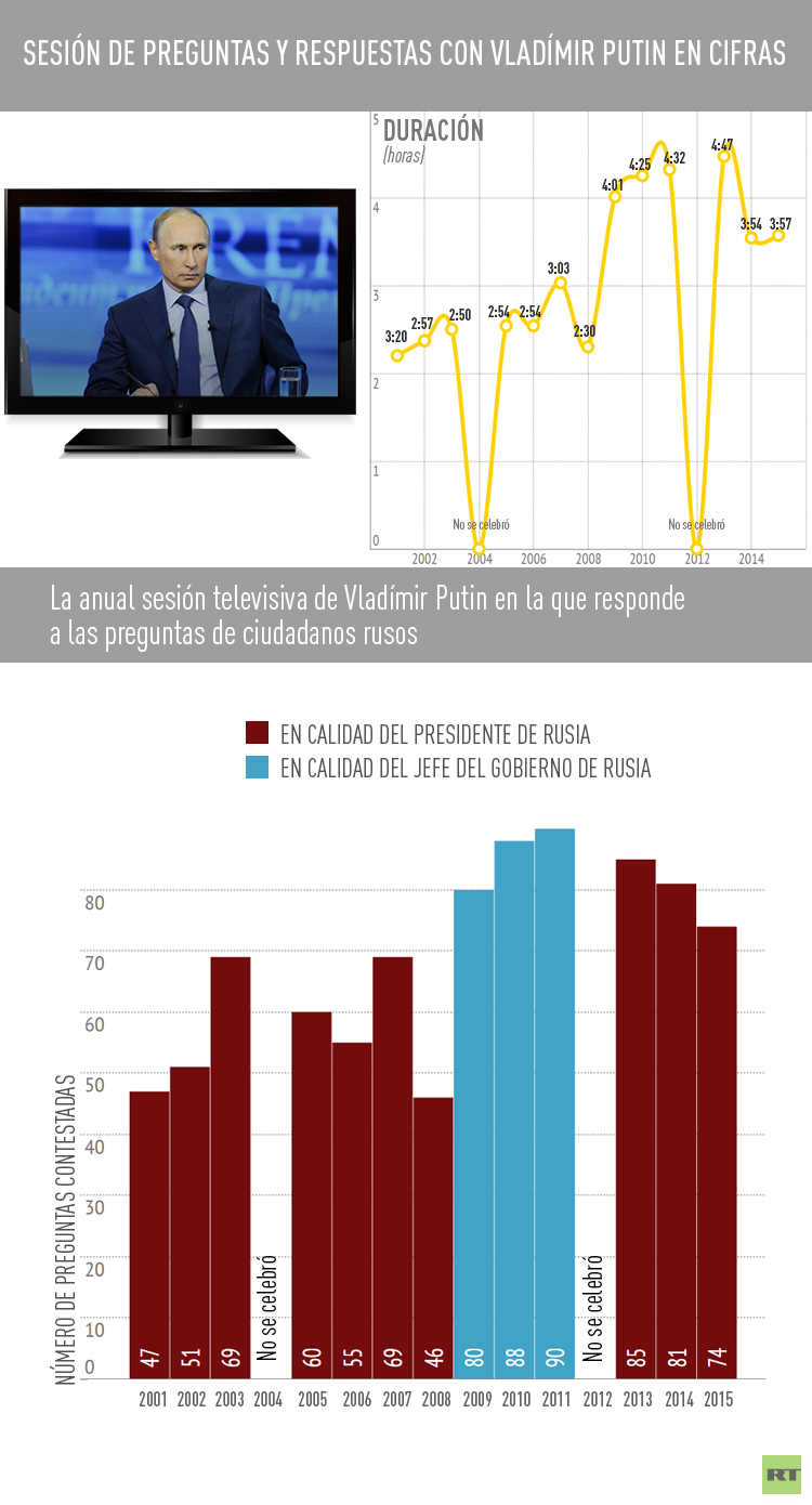 En el transcurso de la 'Línea directa', que empezó a las 9:00 GMT de este jueves y duró 3 horas y 57 minutos, Vladímir Putin ha contestado a 74 preguntas de habitantes de todas las regiones de Rusia, informa el sitio web del Kremlin. El presidente Putin ha recibido más de 3 millones de preguntas, una cifra récord en este programa. Algunas fueron elegidas entre los miles de preguntas enviadas desde el 9 de abril, otras fueron transmitidas en directo desde varios ciudades rusas.