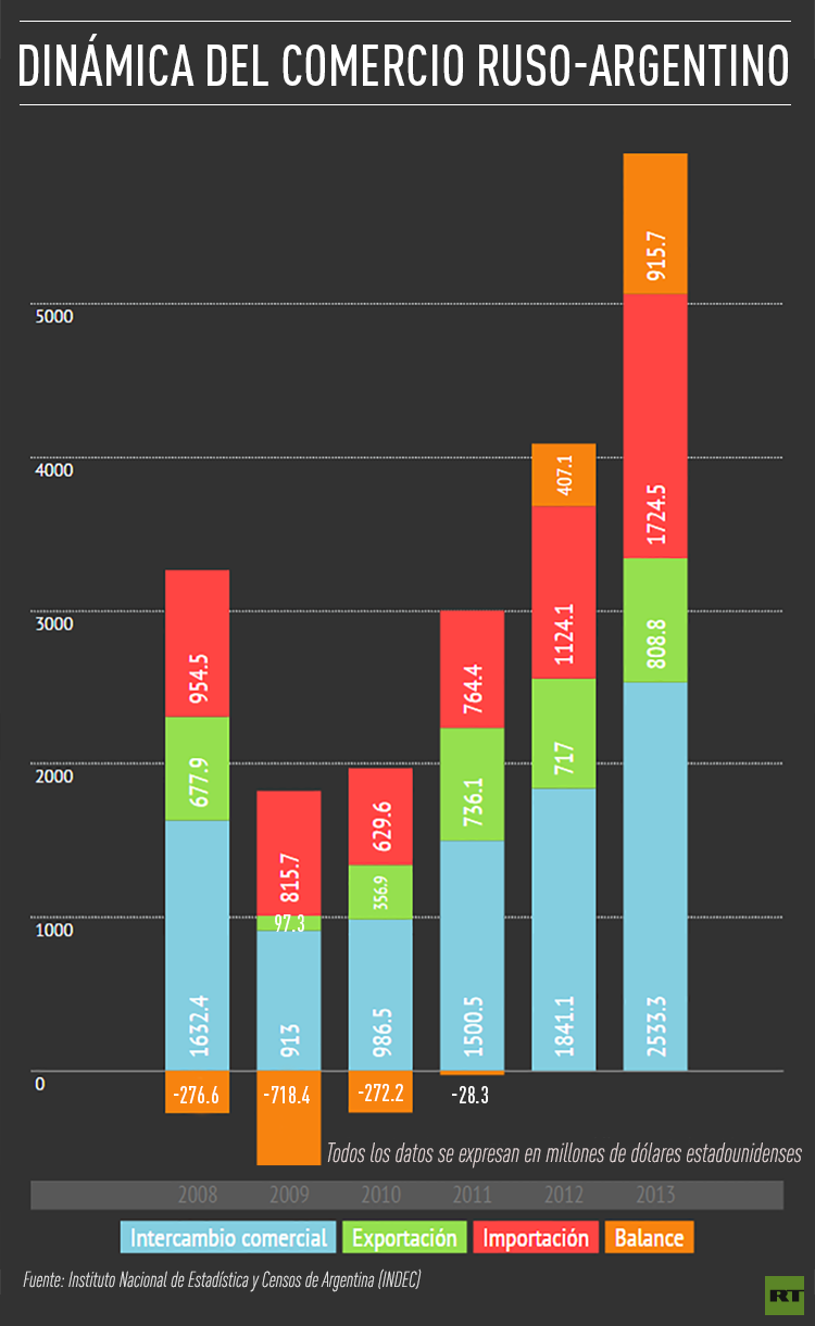 En julio de 2014, el presidente de Rusia, Vladímir Putin, durante su gira por América Latina viajó a Buenos Aires, donde se abordaron importantes contratos dirigidos a aumentar el comercio entre ambas naciones.