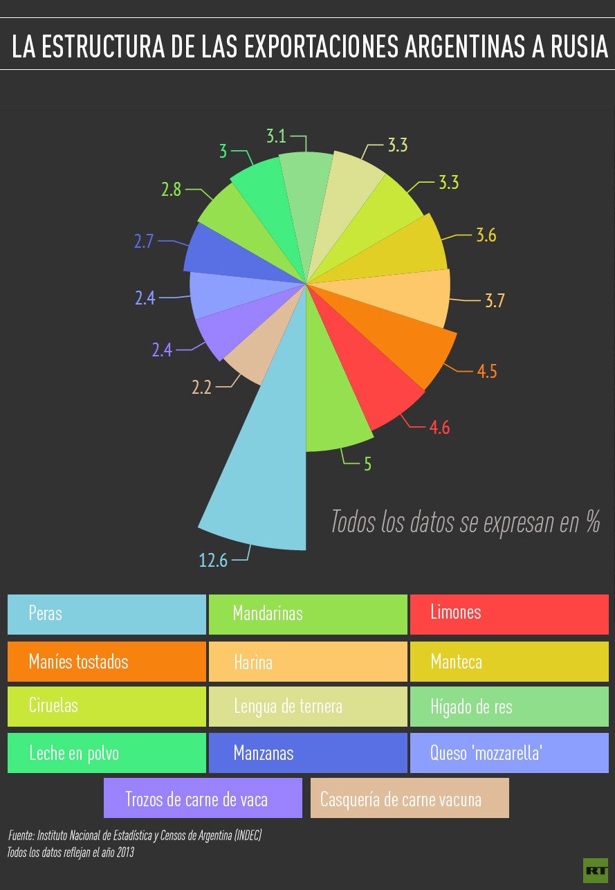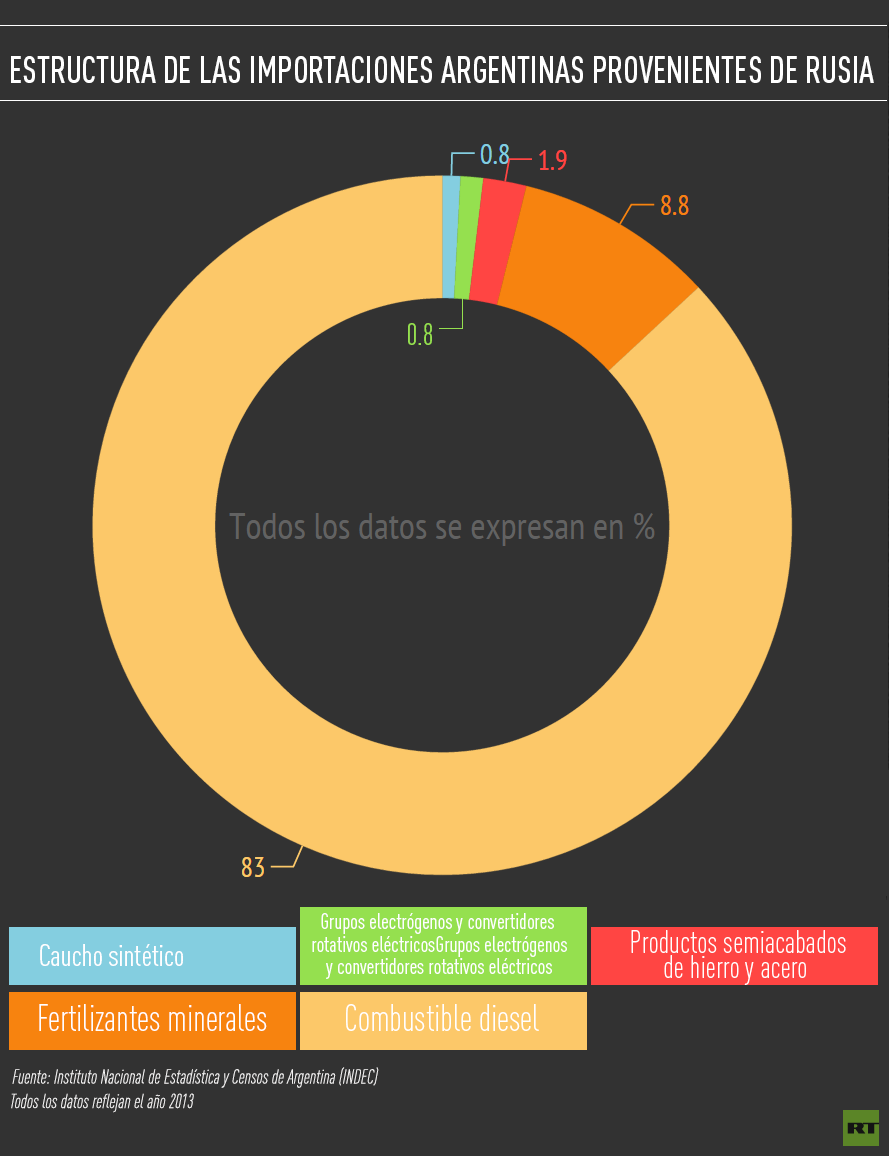 -A lo largo de la segunda mitad del siglo XX, entre las mercancías rusas que llegaban a Argentina destacaban el gasoil y los fertilizantes minerales. Argentina vendía a la URSS, y luego siguió exportando a Rusia, fruta, carne y productos lácteos.