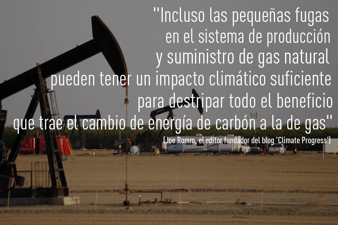 "Incluso las pequeñas fugas en el sistema de producción y suministro de gas natural pueden tener un impacto climático suficiente para destripar todo el beneficio que trae el cambio de energía de carbón a la de gas", escribe Joe Romm, el editor fundador del blog 'Climate Progress', citado por alternet.org.