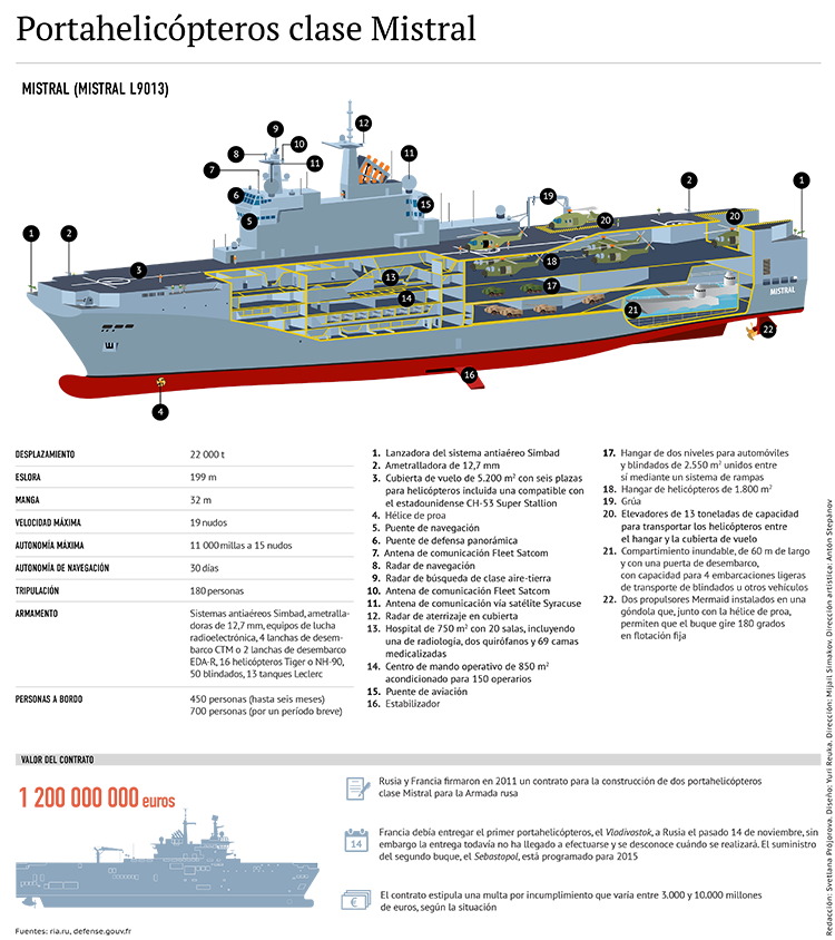 Las autoridades francesas han enviado a Moscú los proyectos de documentos sobre la terminación del acuerdo intergubernamental para la construcción para Rusia de dos portahelicópteros tipo Mistral y de dos contratos para estas las naves, informa el diario ruso 'Kommersant' con referencia a sus fuentes en la esfera de la cooperación técnico-militar. Las propuestas prevén "devolver a Rusia alrededor de 785 millones euros, un monto que podrá obtener solo después de que el Gobierno ruso autorice por escrito la venta de los buques a terceros sin reservas", señala el periódico.