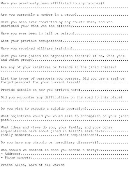 Los candidatos a terroristas deben detallar si viajan con un pasaporte falso o auténtico, si han cumplido alguna condena en prisión y si han pertenecido a algún otro grupo. Por último, el voluntario tiene que decir si está listo para convertirse en un terrorista suicida y proporcionar los datos de la persona con la que se debe contactar en caso de que el candidato se inmole. En el cuestionario se señala que la información proporcionada no se compartirá con terceras partes salvo con Dios.