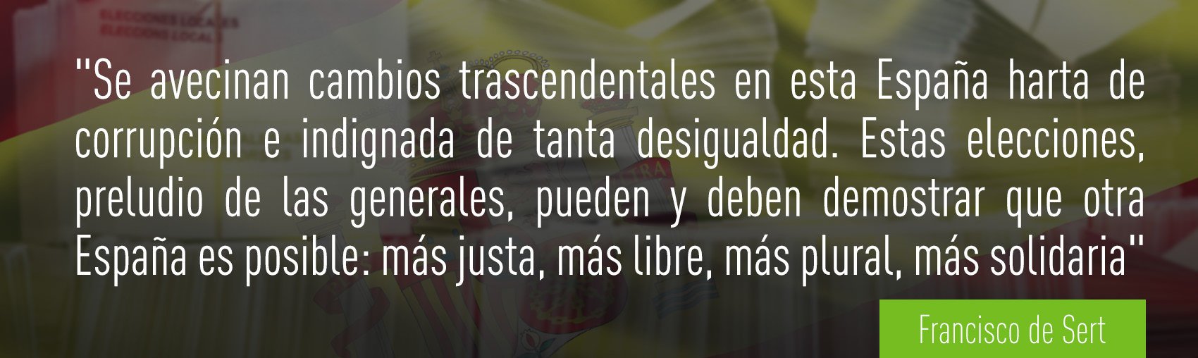 "Se avecinan cambios trascendentales en esta España harta de corrupción e indignada de tanta desigualdad. Estas elecciones, preludio de las generales, pueden y deben demostrar que otra España es posible: más justa, más libre, más plural, más solidaria", agrega.