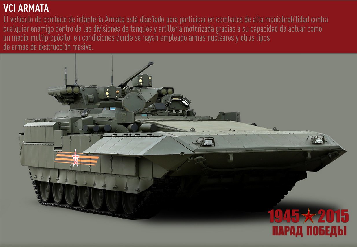 Tras el desfile del novedoso armamento ruso en el Día de la Victoria en la Segunda Guerra Mundial, varios países expresaron su interés en adquirir, en primer lugar, los tanques y vehículos de combate de infantería Armata, declaró el asesor del presidente ruso en materia de colaboración técnica y militar, Vladímir Kozhin.