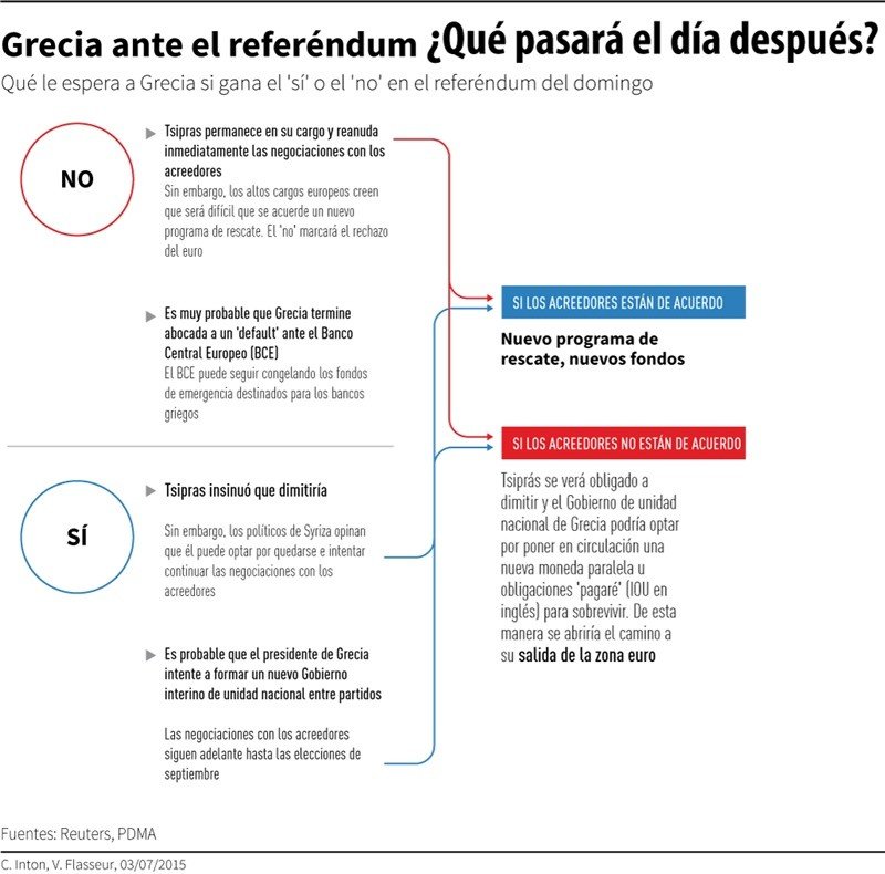 Si los griegos votan a favor de las reformas que propone Europa, en primer lugar todos los ojos se posarán sobre Atenas, más exactamente sobre la reacción del Gobierno. Tsipras ha dicho que en este caso podría dimitir, algo similar a lo que anunció el titular de Hacienda Yanis Varufakis, que dijo que dejaría su cargo. No es un hecho que el Gobierno vaya a renunciar, pero suponiendo que suceda, se convocarían nuevas elecciones parlamentarias para formar un nuevo Gobierno con el que la UE tendrá que renegociar.