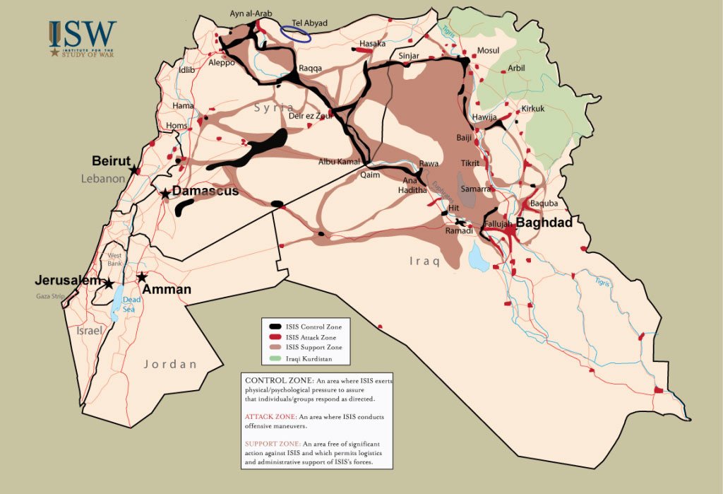 El mapa que se muestra a continuación, facilitado por el Instituto para el Estudio de Guerras, muestra la situación en Irak, donde la zona verde en el norte del país representa el área bajo control de los kurdos iraquíes.