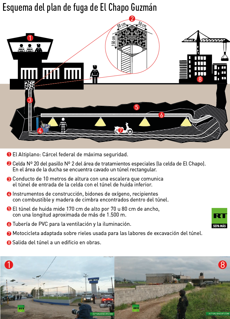 La red de túneles estaba muy bien equipada y preparada deliberadamente para El Chapo, ha subrayado el funcionario. El túnel contaba incluso con tuberías de ventilación y alumbrado. Allí quedó abandonada una motocicleta adaptada sobre raíles como mecanismo de tracción mediante la cual, muy probablemente, fue extraída la tierra resultante de la excavación, y que también sirvió para transportar las herramientas y la maquinaria utilizadas para la perforación.