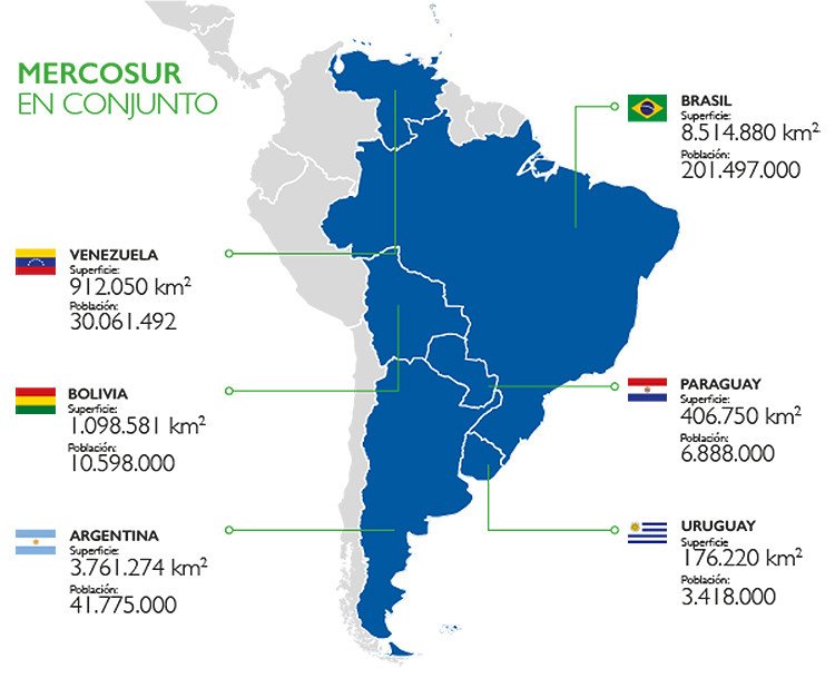 El Mercado Común del Sur (Mercosur) es un proceso de integración regional protagonizado por Argentina, Brasil, Paraguay, Uruguay y ahora también por Venezuela y Bolivia. Su objetivo principal consiste propiciar un espacio común que, mediante la integración competitiva de las economías nacionales al mercado internacional, genere oportunidades comerciales y de inversiones.