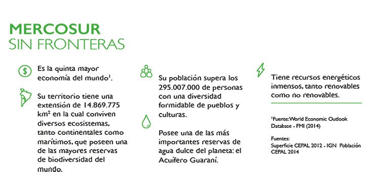 El bloque Mercosur es la quinta economía mundial, si se considera el PIB nominal de casi 3,3 billones de dólares producido por todo el bloque. Posee las tres urbes más ricas, extensas y pobladas de Sudamérica: São Paulo, Buenos Aires y Río de Janeiro. Cuenta con las dos empresas petroleras más grandes de Latinoamérica: Petrobras y PDVSA. El Mercosur posee también la selva tropical más grande del planeta: la selva amazónica y controla las mayores reservas energéticas, minerales, hídricas y petroleras del planeta.