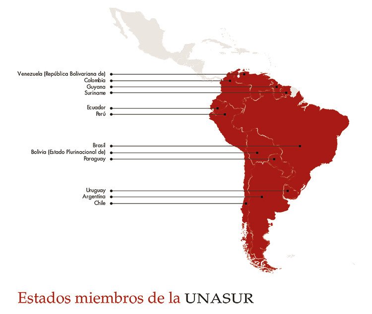 Estados miembro: Argentina, Bolivia, Brasil, Colombia, Chile, Ecuador, Guyana, Paraguay, Perú, Surinam, Uruguay y Venezuela.