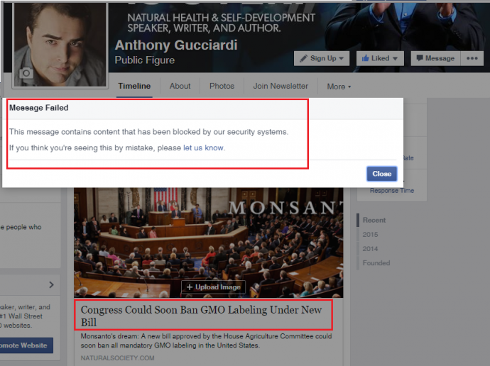 Cuando los usuarios tratan de compartir la publicación, Facebook emite una advertencia que dice 'Este mensaje contiene información que ha sido bloqueada por nuestros sistemas de seguridad', denuncia el autor del artículo, Anthony Gucciardi.