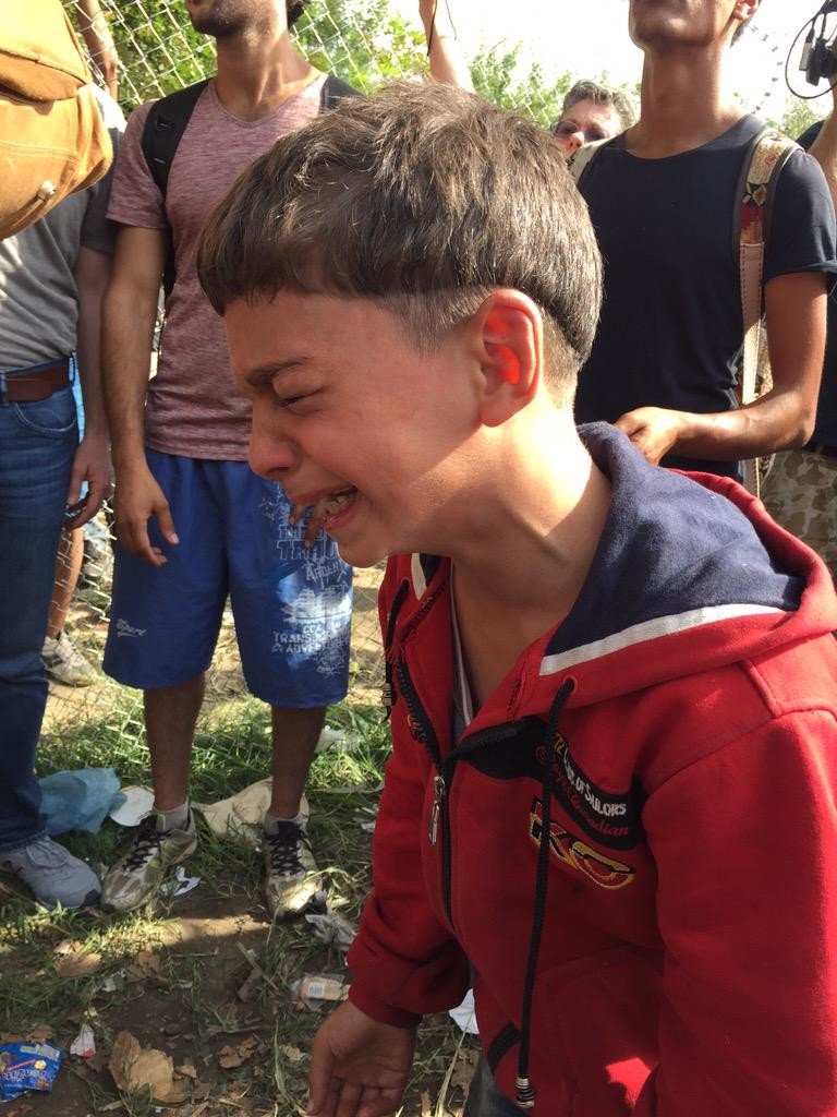 (foto Izq) Ahora afectado por el gas pimienta y (dcha) hace 5 horas desayunando. Indignacion en la frontera hungara pic.twitter.com/kU6OHhY88Y