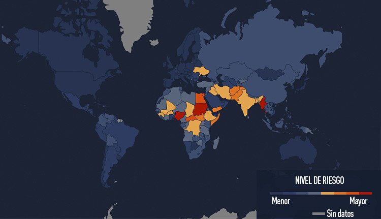 Entre los cinco primeros países de la lista también se encuentran Nigeria (12,3%), Sudán (8,5%), Egipto (5,4%) y la República Centroafricana (5,3%). Al mismo tiempo, un riesgo elevado experimentan Sudán del Sur, la República Democrática del Congo, Afganistán, Pakistán y Yemen. Por otro lado, el único país europeo que los elaboradores del mapa reflejaron en tono claro en el mapa ha sido Ucrania.