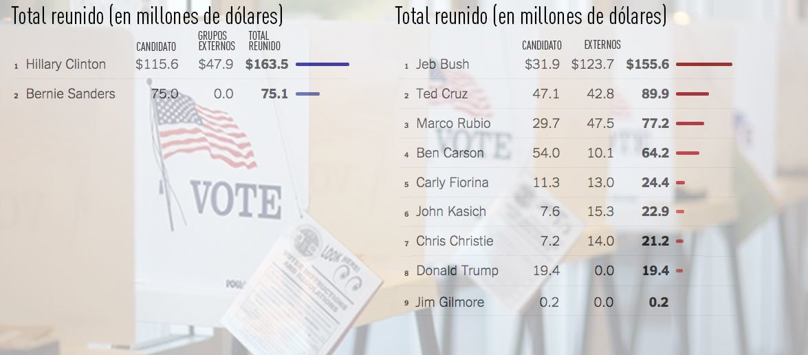 La siguiente gráfica muestra los millones de dólares reunidos por los precandidatos y engloba tanto la cantidad de dinero recaudado en campaña como lo obtenido gracias a los Comités de Acción Política (PAC, por sus siglas en inglés), los cuales incluyen donaciones de particulares, sindicatos y empresas.