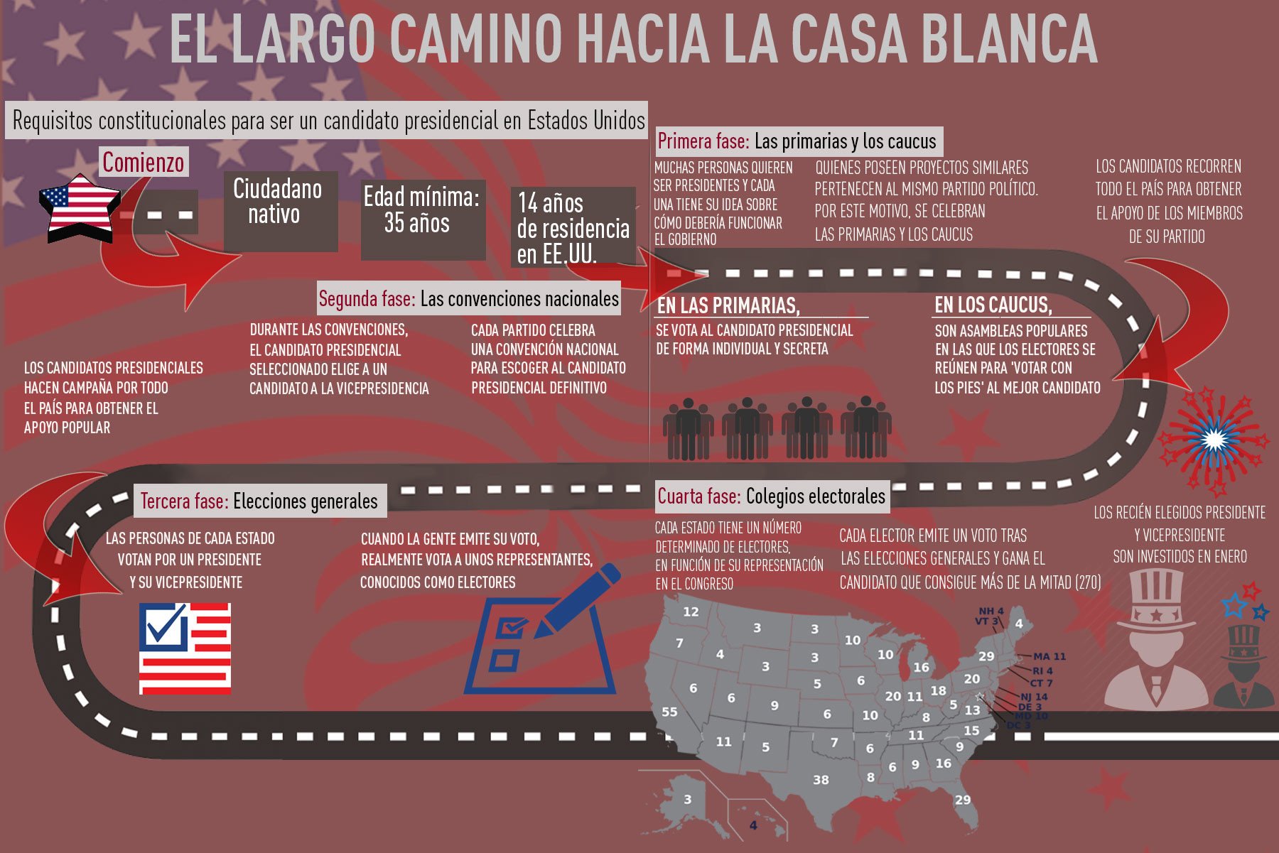 Así, en cada estado los partidos establecen sus listas de electores, que se presupone que votarán por el candidato presidencial nominado por su propio partido. En 48 de los 50 estados (excepto en Maine y Nebraska), si un partido gana con una mayoría relativa de los votos se queda con todos los electores en disputa, no solo con los que le corresponderían en función del recuento de papeletas. De esta manera, un candidato precisa 270 votos del Colegio Electoral para llegar a la Casa Blanca. El ganador sucederá a Barack Obama y asumirá sus funciones como presidente el 20 de enero de 2017.