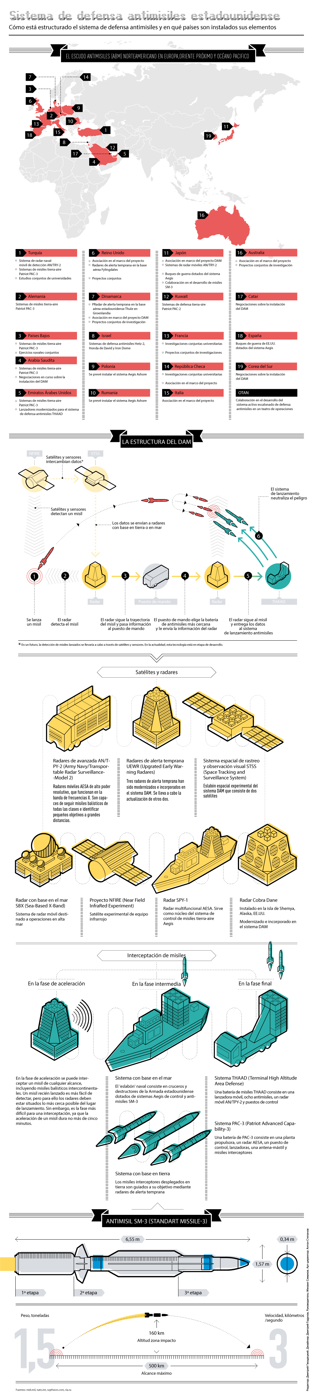 El Escudo Antimisiles de Washington es un sistema de defensa antimisiles diseñado para interceptar proyectiles enemigos antes de que alcancen su objetivo. La tecnología que se desarrolla y utiliza en EE.UU. está diseñada para enfrentarse a misiles balísticos de todos los alcances: corto, medio, intermedio y largo. Dado que los misiles balísticos tienen distinto alcance, velocidad, tamaño y características de rendimiento, el sistema de defensa de misiles balísticos tiene una estructura de 'capas'. En la siguiente infografía se explica en detalle cómo funciona el AMB estadounidense, cuyos distintos componentes son instalados en 19 países.