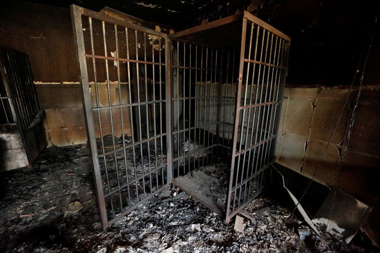 "La habitación es sofocante, todavía está cargada con el olor rancio del sudor de los que fueron encarcelados aquí", describe la columnista. Morris señala que las ventanas de la casa están cubiertas con láminas de metal: "La poca luz que se filtra arroja resplandor sobre decenas de retales atados en las alfombras: sábanas, cortinas y restos de ropa unidos para hacer almohadas". El hecho de que sean decenas da una indicación de la cantidad de presos aproximada que estuvieron encerrados en esa cárcel. El pasillo exterior ardió.