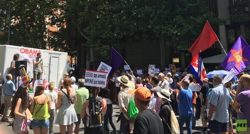 "Obama Go Home" ha sido el lema de la concentración con que el colectivo Marchas de la Dignidad ha recibido en Madrid al presidente de Estados Unidos. Bajo el intenso y previsible calor que hacía en este mediodía de Julio, casi un millar de personas se reunieron frente a la Embajada de Estados Unidos para protestar por la visita del que consideran máximo responsable de un sistema opresor, imperialista y asesino.