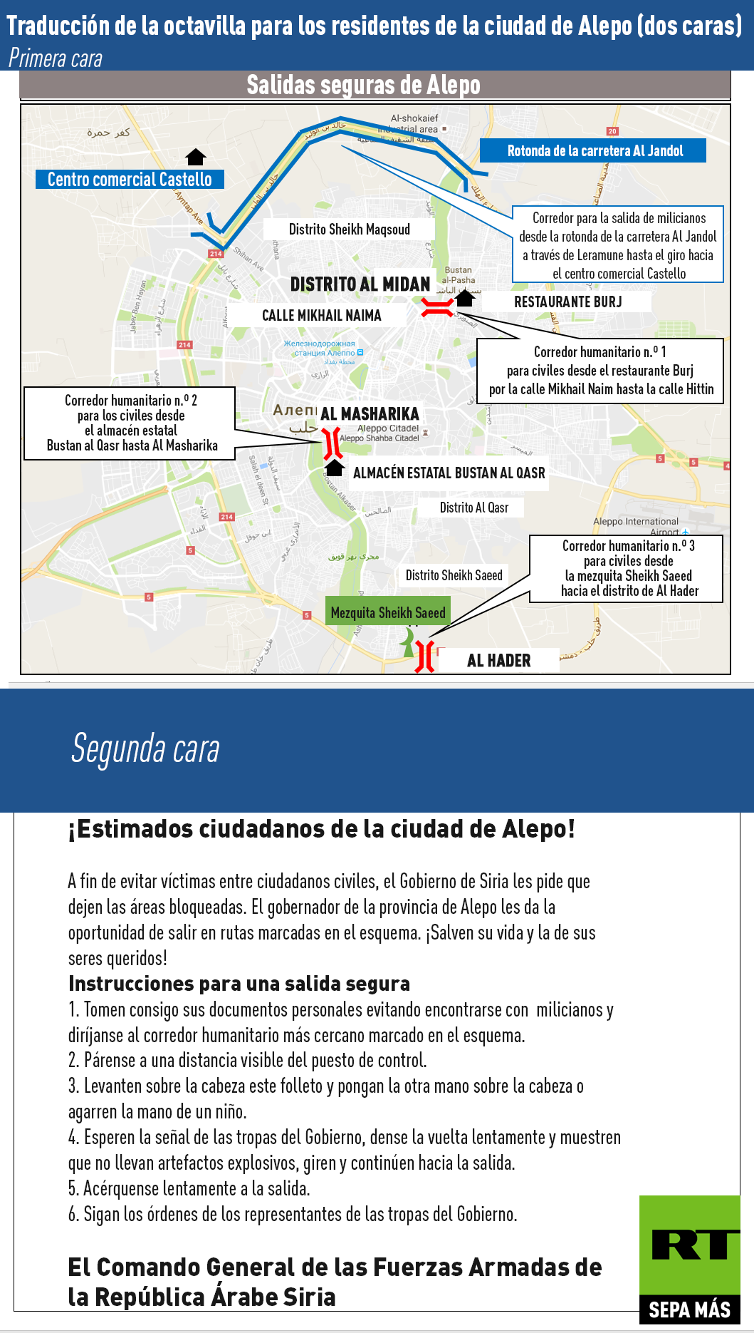 En el marco de la operación humanitaria a gran escala emprendida este jueves por Moscú y Damasco en la ciudad siria de Alepo, militares de ambos países lanzan octavillas con indicaciones sobre el uso de los corredores para que los civiles salgan de forma segura de la ciudad.