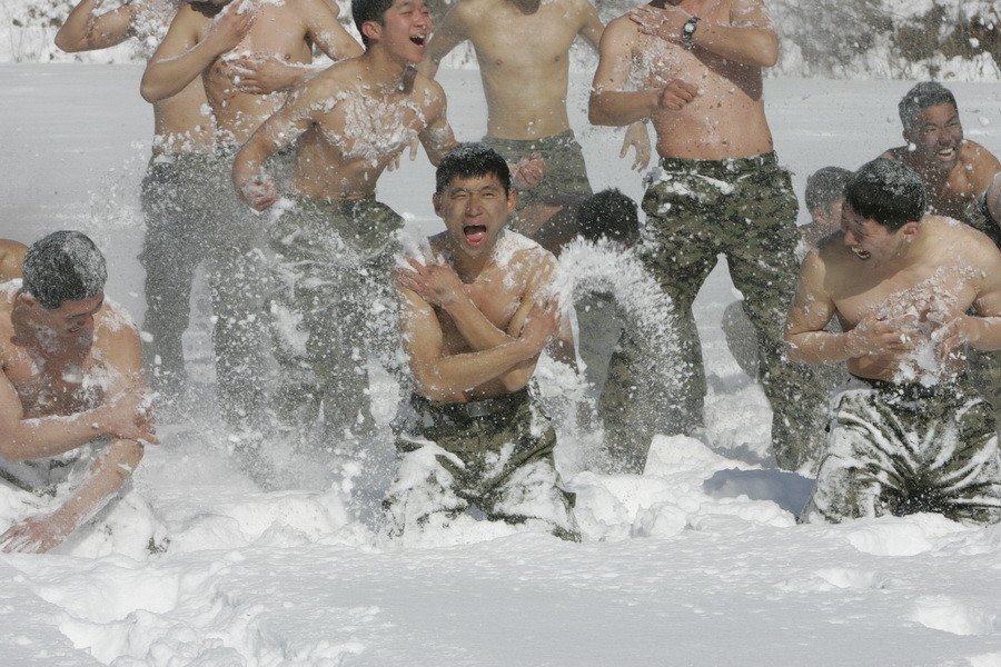 Durante los entrenamientos de guerra de invierno en las montañas de Pyeongchang, al este de Seúl, los miembros del Comando de Tácticas Especiales realizaron ejercicios físicos con el torso desnudo.