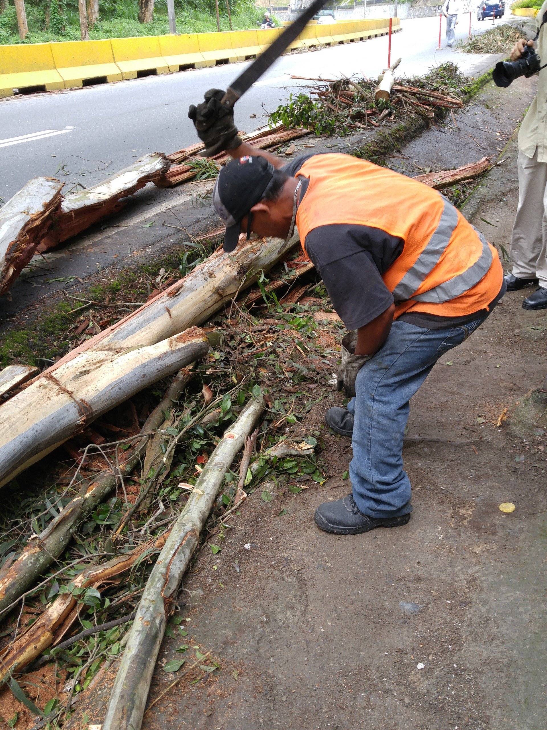Mientras habla, uno de sus compañeros corta con un machete una de las ramas que permanecen en la orilla de la carretera.