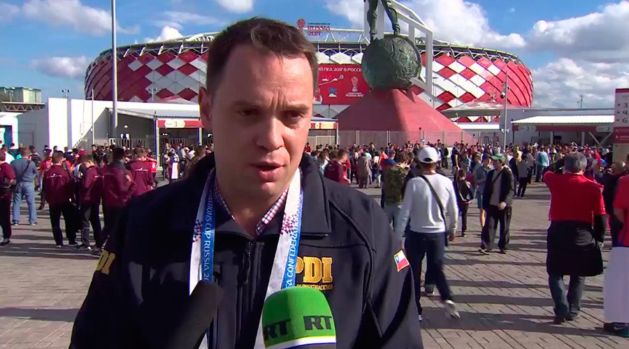 "No se han producido incidentes hasta el momento, los aficionados chilenos se comportan correctamente y no ha habido problemas en los estadios. Así que esperamos que los 'fans' chilenos sigan así", comenta el policía a RT en un ruso impecable.