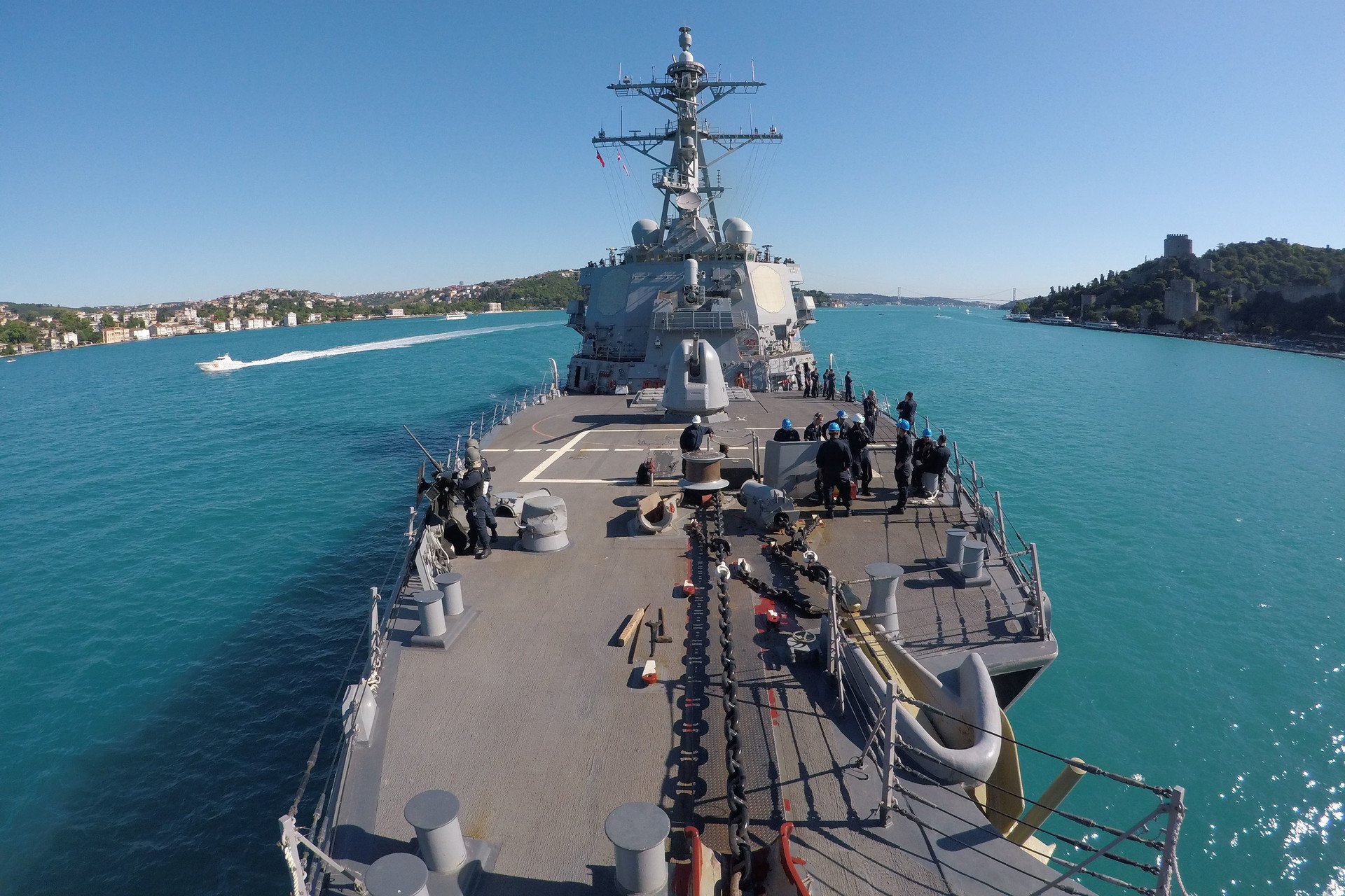 Al mismo tiempo, dos buques de guerra de EE.UU. han entrado ya en aguas del mar Negro a través del estrecho de Bósforo. Se trata del destructor de misiles Carney (DDG-64) y el crucero de misiles Hue City (CG 66). Juntos llevan a bordo a un total de 800 tripulantes y efectivos de la Infantería de Marina.