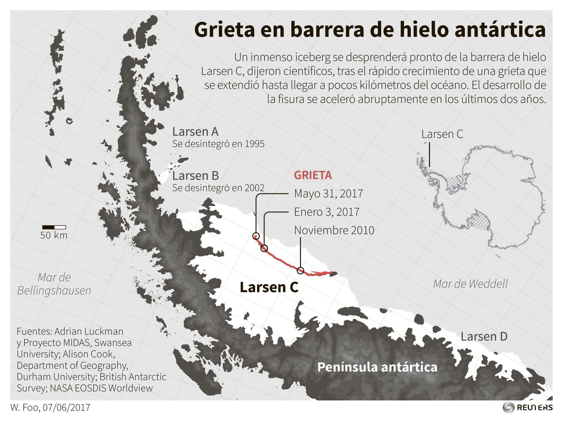 La enorme fisura que ha originado este nuevo iceberg ha estado creciendo durante un periodo de dos años. Solo desde el 25 de mayo hasta el 31 de ese mismo mes, la brecha creció 17 kilómetros y en los últimos días los datos recogidos muestran que la grieta se había ramificado en varias ocasiones. "Ahora vemos un gran iceberg, pero es probable que se rompa en pedazos a medida que pase el tiempo", ha indicado Adrian Luckman, líder del proyecto británico MIDAS, que monitorea la región.