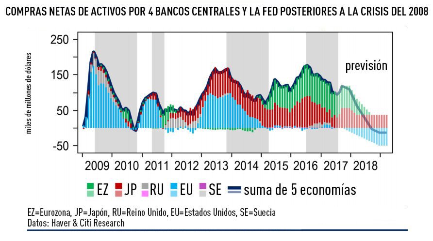 Se trata de la previsible contracción simultánea de las hojas de balance de al menos cuatro bancos centrales (el europeo, de Japón, Suecia, el Reino Unido) y la Reserva Federal, en Estados Unidos.