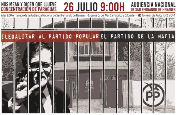 Conocida por las protestas que rodearon el Congreso en el año 2012, el objetivo de la plataforma es pedir la ilegalización del PP, al que definen como el "el partido de la mafia". Bajo el lema "Nos mean y dicen que llueve", los organizadores han solicitado a los asistentes que acudan con un paraguas para simbolizar sus quejas.