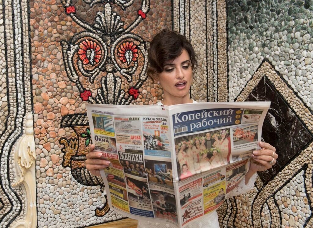 Penélope Cruz lee con detenimiento el periódico ruso 'Kopeiski Rabochi' ('Obrero de Kopeisk'). ¿Una escena surrealista? No, y no es una broma. La famosa actriz efectivamente posa con un periódico que se publica en la ciudad rusa de Kopeisk, en las inmediaciones de Cheliábinsk, y lo lee con la boca abierta (y eso que no llegó todavía a la última página, donde luce un anuncio que reza 'novios', en mayúscula).