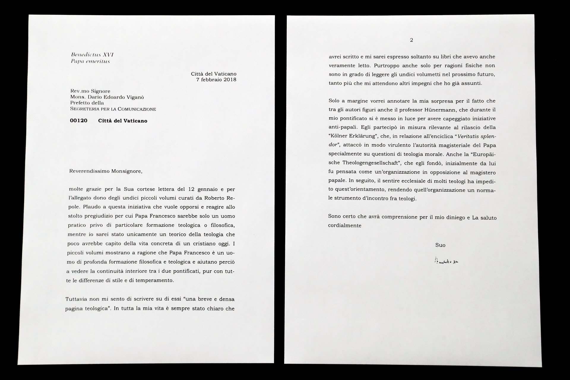 Este 12 de marzo, en el marco de la presentación de la colección 'La Teología del Papa Francisco' –que se celebró por el quinto aniversario de la elección del pontífice argentino– monseñor Dario Vigano, jefe de comunicaciones del Vaticano, citó algunas de las líneas de una carta del papa emérito Benedicto XVI, quien elogió la sólida educación teológica y filosófica del actual papa, así como su iniciativa de demostrar la "continuidad interior" entre los dos pontífices.