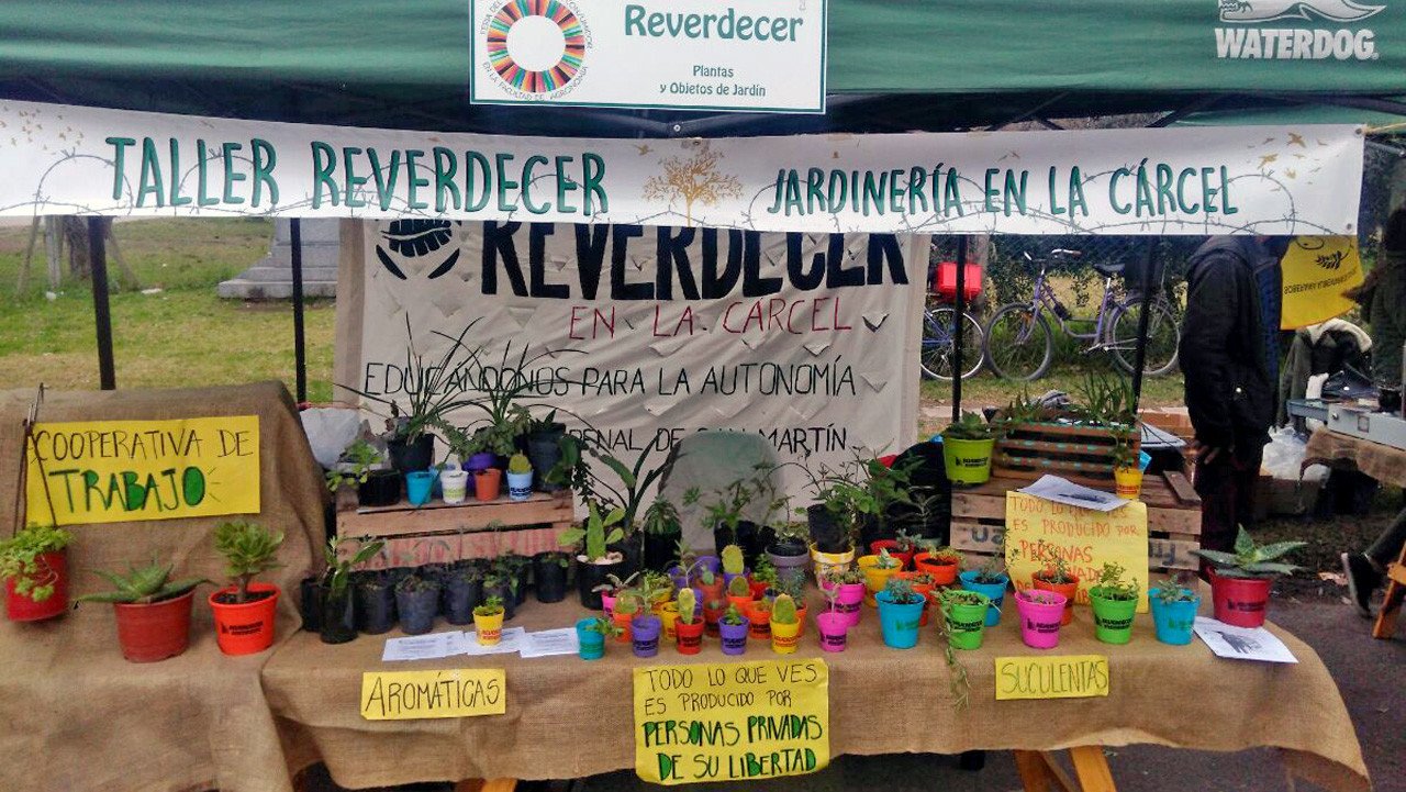 Julia Caironi, miembro del taller Reverdecer, un proyecto de extensión universitaria de la ya mencionada Facultad de Agronomía, explica las bases del proyecto nacido hace seis años: "Damos talleres de huerta y jardinería en la cárcel para hombres y mujeres. Tenemos un espacio de plantas, tipo vivero, y las vendemos acá". Además, aclara que el dinero percibido se deposita en la cuenta judicial de cada interno.
