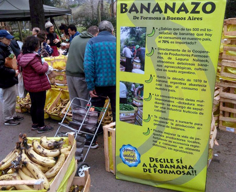 "Nos quejamos del dólar, pero acá importamos el 70% de lo que consumimos de bananas y tenemos productores muriéndose de hambre. Hay algo bastante oscuro", critica. Mientras que un cajón de bananas del circuito industrial cuesta entre 400 y 500 pesos (13 y 16 dólares), las de la feria valen 250 (8,30 dólares), según el entrevistado. "Estamos probando que alguien puede comer bananas de mucha mejor calidad, pagándole directamente al productor", resalta. Todo ello sin mencionar las constantes fumigaciones a las cuales son expuestas las bananas importadas de Ecuador y Costa Rica, que viajan tres meses congeladas en barcos.