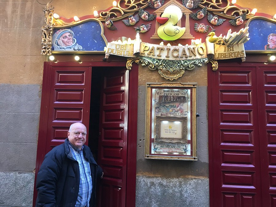 Desde 2012 es, además, el 'sumo pontífice' de la delirante, entrañable y finamente irónica 'Iglesia Patólica'. Cada domingo celebra en el madrileño barrio de Lavapiés una misa que defiende valores supremos: la duda y la inocencia, bajo la mirada tierna de un pato de goma que hace las veces de Dios.