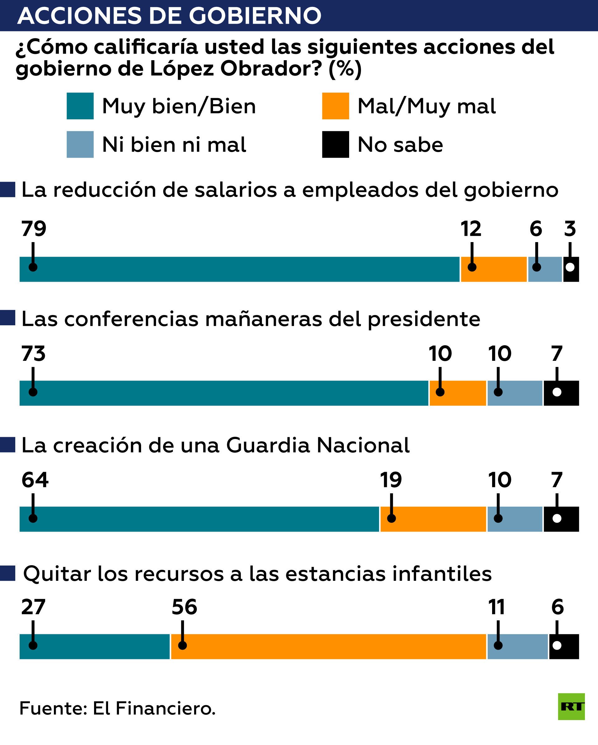 La encuesta también refleja una alta aprobación de los mexicanos hacia las acciones realizadas por López Obrador, incluyendo la creación de la Guardia Nacional, bajar salarios a altos funcionarios públicos y las conferencias de prensa matutinas.