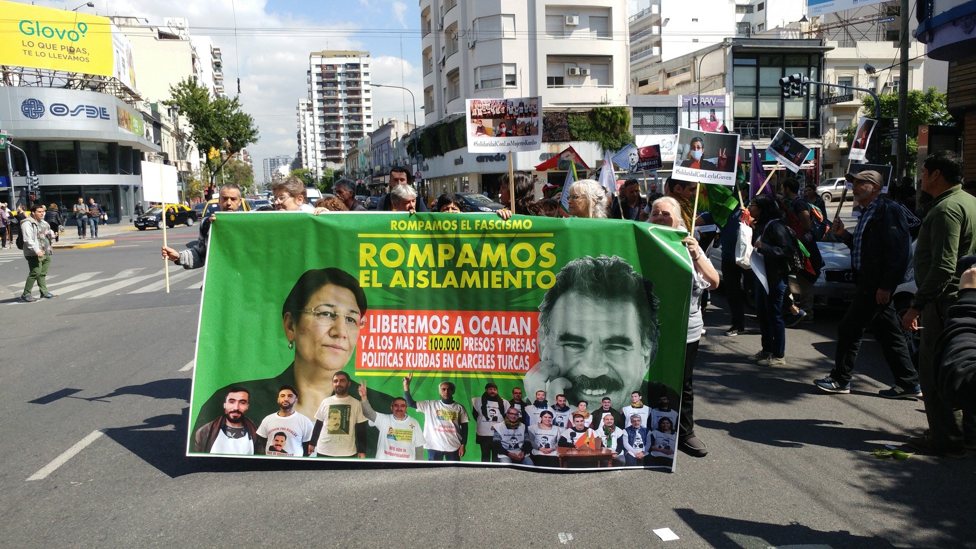 Son las dos de la tarde de un día de marzo y en la Ciudad de Buenos Aires, en el barrio de Palermo, una bandera de lienzos verdes aclama una solicitud: 'Rompamos el aislamiento. Liberemos a Öcalan'. Una manifestación kurda marcha hacia la sede de la embajada de Turquía, en reclamo por la liberación de Abdullah Öcalan, el líder del PKK.