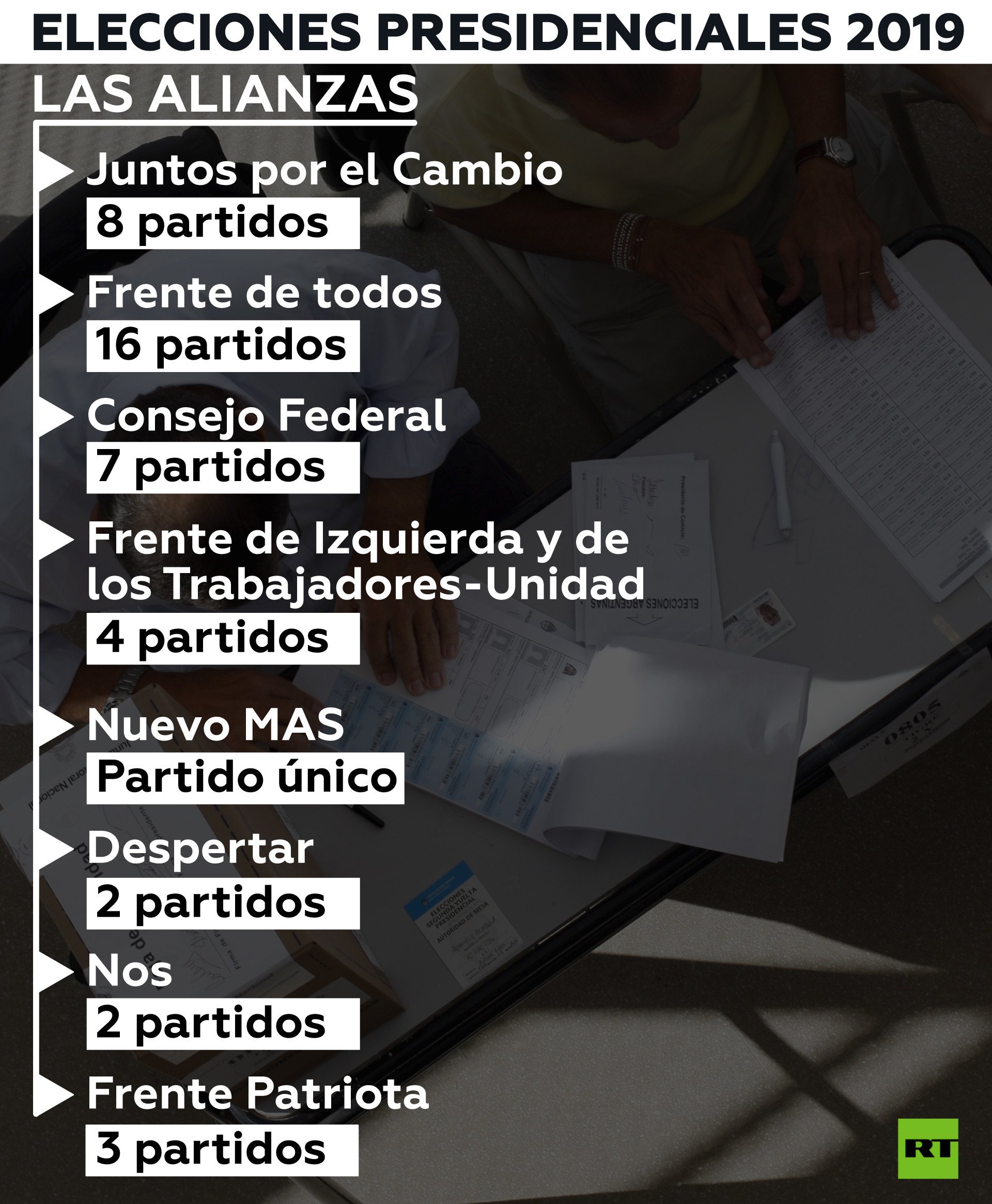 Así, esta coalición tiene 16 fuerzas políticas, donde sobresalen el Partido Justicialista (PJ) —fundado por el antiguo líder Juan Domingo Perón— y el FR, sumado a otros grupos más pequeños de esa nación, como el Partido Comunista (PC).