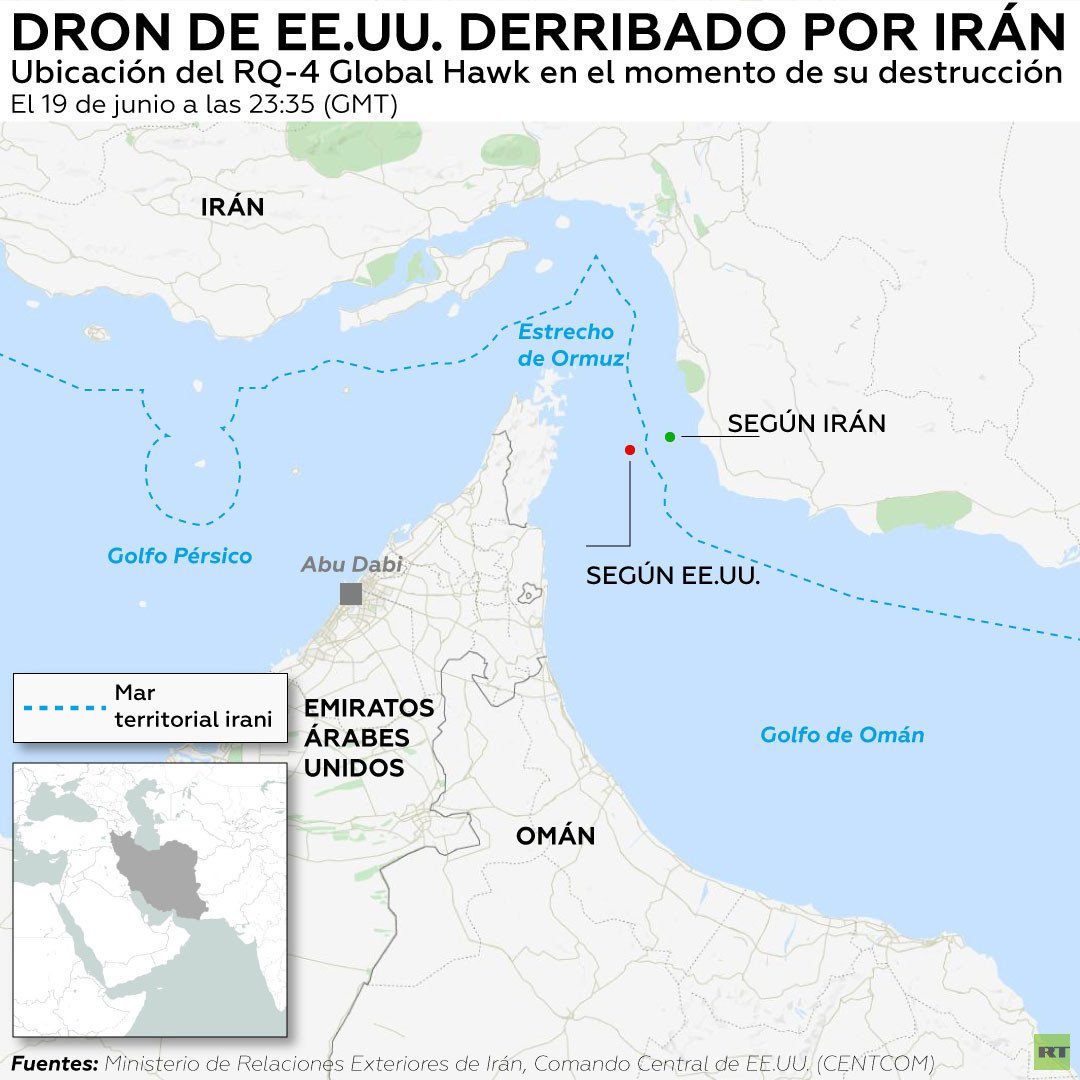 Teherán sostiene que la aeronave de vigilancia había ingresado a su espacio aéreo en la provincia de Hormozgán al momento de su derribo, pero Washington afirma que en ningún punto de su trayecto el dron salió del espacio aéreo internacional.