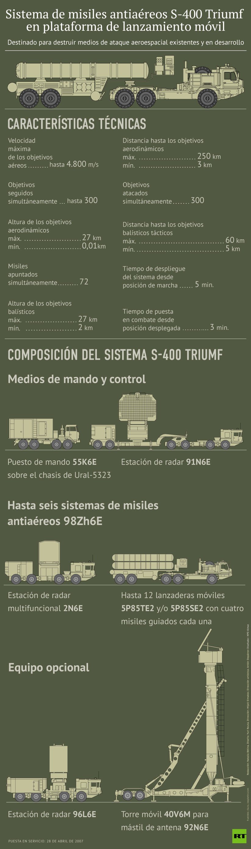 El sistema de misiles antiaéreos S-400 Triumf está diseñado para brindar una protección de alta eficiencia contra ataques aéreos con misiles balísticos estratégicos, de crucero, tácticos y otros tipos. Así, es capaz de alcanzar objetivos que se mueven en el aire, incluidos aviones y misiles de crucero, desde una distancia de 400 kilómetros.