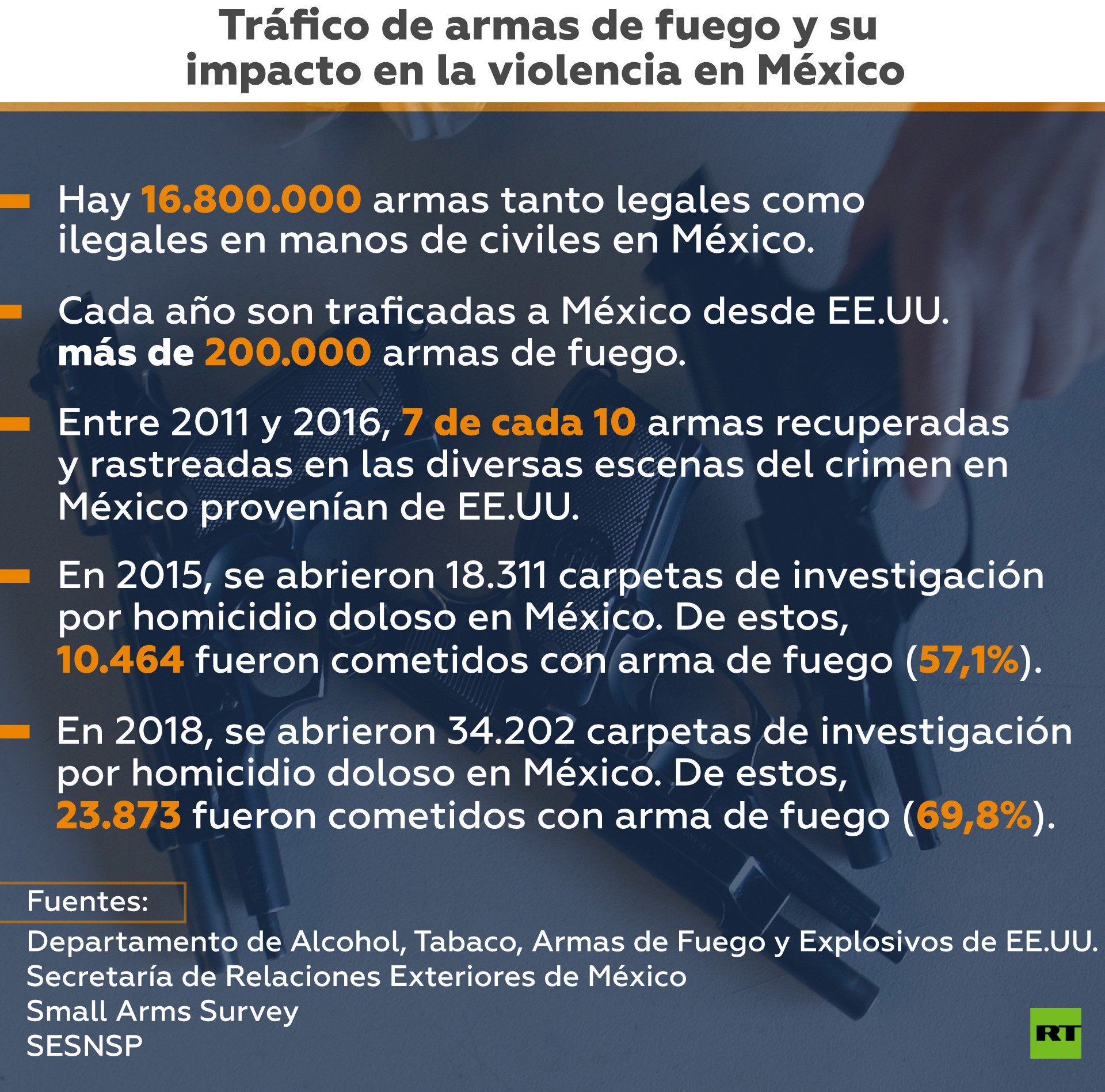 El Departamento de Justicia estadounidense, a través de la Oficina de Alcohol, Tabaco, Armas de fuego y Explosivos (ATF, por sus siglas en inglés), encontró que 7 de cada 10 armas que fueron recuperadas por la policía en México durante una escena del crimen, y enviadas con ellos para su análisis, tenían su origen en EE.UU.